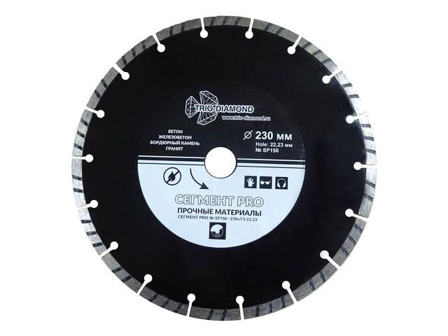 Алмазный диск Trio Diamond Сегмент PRO 230 мм - выполнен методом холодного прессования. Диск используется для сухой резки железобетона, бетона, огнеупоров и бордюрного камня. Толщина алмазного слоя 3 мм, а высота 7,5 мм. Посадочное отверстие - 22,23 мм. Сегментный диск с турбо кромкой обладает повышенной производительностью. Диск подходит для работы на УШМ.