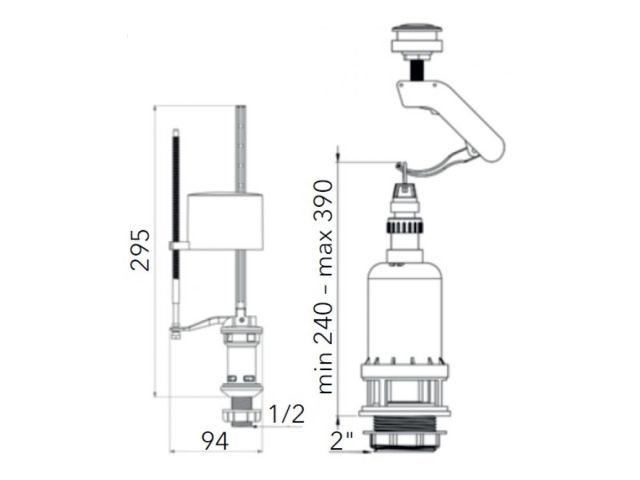 Арматура для бачка - Однокнопочный выпускной механизм; - Боковой впускной клапан; - Белое покрытие кнопки; - Крепления из оцинкованного черного металла.