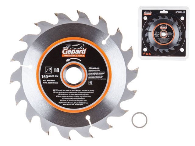 Диск пильный 160х20/16 мм 18 зуб. по дереву GEPARD(твердоспл. зуб)