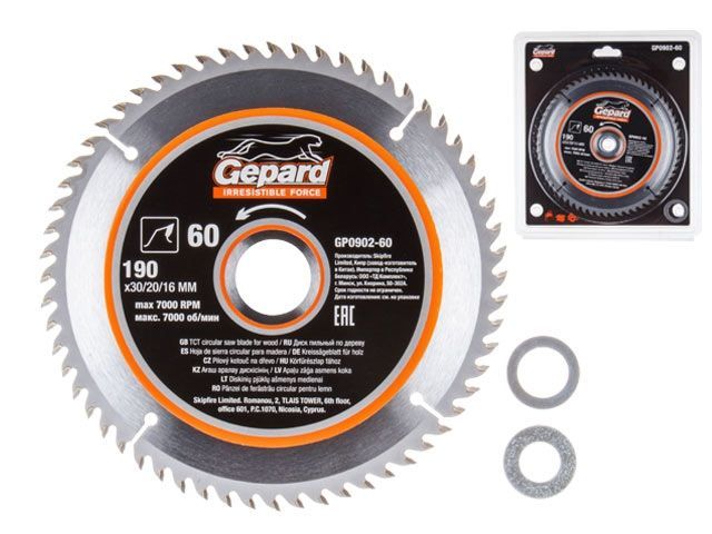 Диск пильный 190х30/20/16 мм 60 зуб. по дереву GEPARD(твердоспл. зуб)