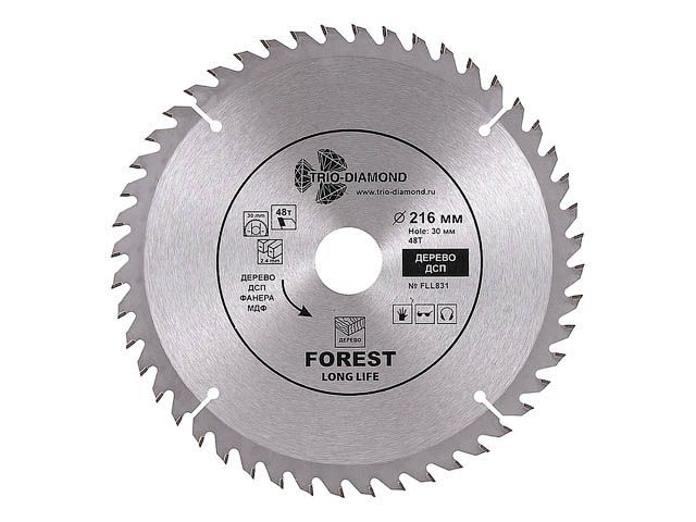 Диск пильный 216х30 мм 48 зубьев TRIO-DIAMOND Forest Long Life (FLL831) предназначен для распила древесины, ДСП, фанеры. Угол заточки 15 градусов. Максимальное число оборотов 7000 RPM. Тип диск пильный Диаметр 216 мм Количество зубьев 48 шт Ширина пропила (зуба) 2,4 мм Форма зуба ATB Максимальное число оборотов 7000 обмин Угол наклона зубьев положительный Передний угол 15 Совместимость пила циркулярная, пила дисковая, пила торцовочная