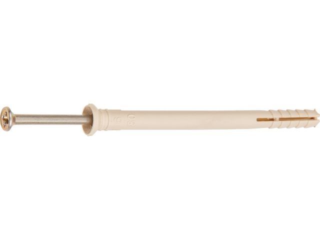 Область применения: сквозной монтаж кронштейнов, дверных коробок, оконных рам, кабельных каналов, обрешетки, гипсокартонных листов (ГКЛ), гипсоволокнистых листов (ГКЛ) и т.д. Материал: нейлон, углеродистая сталь с цинковым покрытием. Особенности: для установки необходимо предварительно просверлить отверстие. Прочность крепежа достигается расклиниванием дюбеля в отверстии гвоздем в момент удара молотком. С помощью крестообразного шлица на головке гвоздя можно легко ослабить или усилить крепеж, демонтировать его. Дюбель-гвоздь с потайным бортиком устанавливается заподлицо, т.е. его шляпка утапливается, благодаря чему возможно производить крепежные работы без последующего выравнивания поверхности. Материал применения: бетон, полнотелый кирпич, пустотелый кирпич, камень, газобетон.