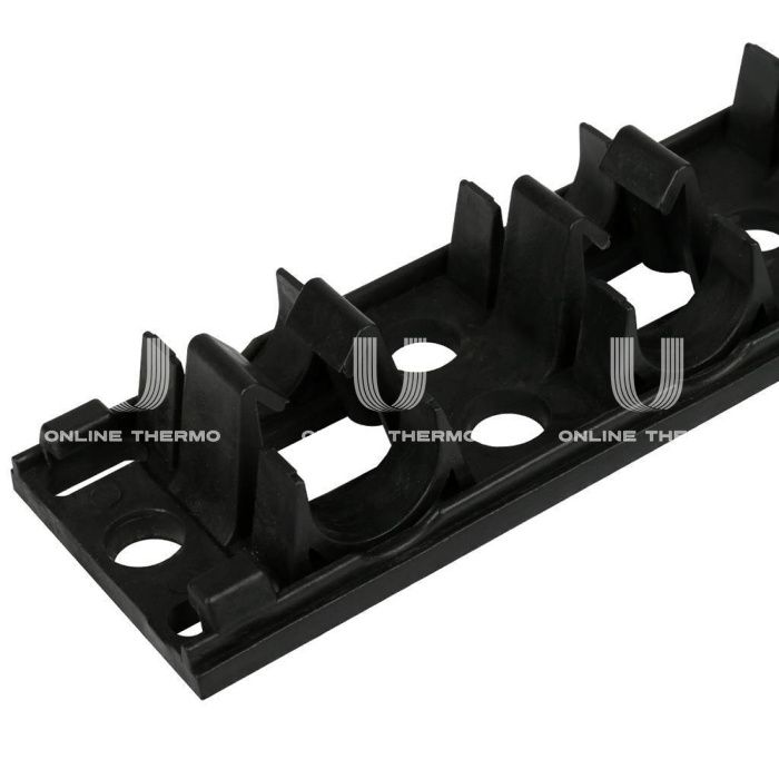 Фиксирующая шина позволяет быстро и надежно фиксировать трубы при монтаже системы водяной теплый пол, предотвращая всплытия и заломы трубы. Шина отформована из полипропилена и представляет собой рейку с клипсами для фиксации полимерной трубы (расстояние между центрами клипс 50 мм, количество клипс на изделии 10 штук). Между клипсами выполнены отверстия для