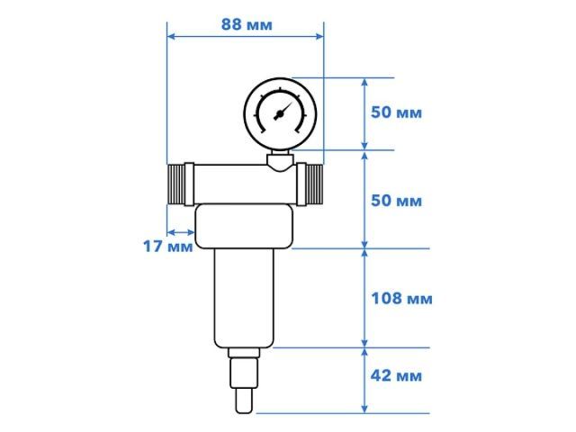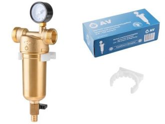 Фильтр самоочищающийся 1' нар. или 3/4'вн., 100 микрон, с манометром, AV Engineering (инд. упак.)(промывной латунный)