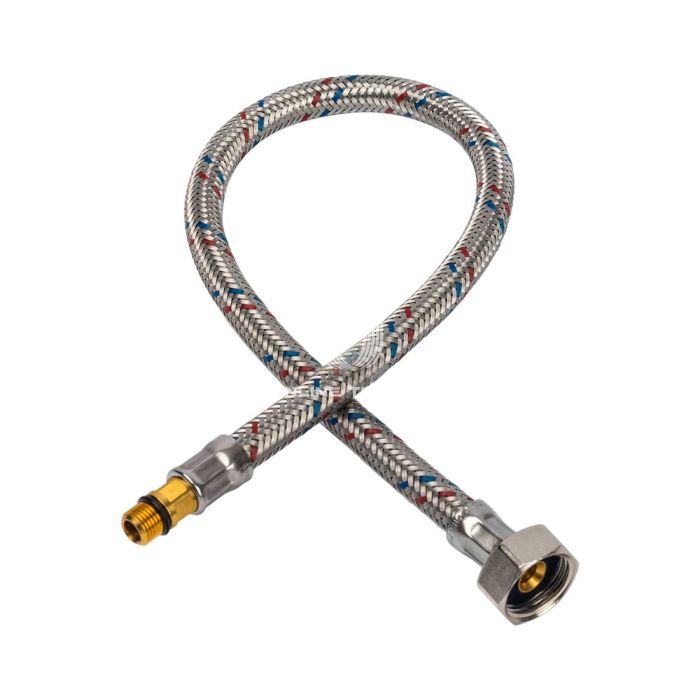 Гибкие подводки STOUT предназначены для присоединения санитарно-технического и бытового оборудования к транспортирующей воду трубопроводной сети. Подводки со штуцером М10 служат для непосредственного подключения к смесителям системы хозяйственно-питьевого водопровода. Гибкая подводка представляет собой шланг из нетоксичной резины в оплетке из нержавеющей стали. По концам подводки напрессованы ниппели с наружной резьбой или с накидной гайкой, укомплектованной прокладкой. Внутренний шланг гибкой подводки STOUT изготовлен из экологичного материала - EPDM (пищевой). EPDM- материал повышенной плотности (монолитный), обеспечивает высокую износоустойчивость (большее количество циклов работы). Латунь, используемая в производстве гибкой подводки - пищевая (латунь специальная, ЛС), в ней меньшее содержание Zn, Pb. Высокое качество запрессовки втулки из нержавеющей стали к шлангу дает 100% защиту от протечек. Технические характеристики: давление разрыва, бар: 20; длина штуцера М10 для смесителя, мм: 35; диаметр Вн/Нар резинового рукава, мм: 8,5/11; внутренний диаметр ниппеля, мм: 6,2; расход среды через подводку на излив при давлении на входе Рраб=3 бар, л/мин: 28; минимальный радиус изгиба и расстояние от изгиба до ниппелей, мм: 48.