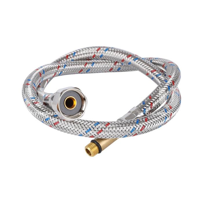 Гибкие подводки STOUT предназначены для присоединения санитарно-технического и бытового оборудования к транспортирующей воду трубопроводной сети. Подводки со штуцером М10 служат для непосредственного подключения к смесителям системы хозяйственно-питьевого водопровода. Гибкая подводка представляет собой шланг из нетоксичной резины в оплетке из нержавеющей стали. По концам подводки напрессованы ниппели с наружной резьбой или с накидной гайкой, укомплектованной прокладкой. Внутренний шланг гибкой подводки STOUT изготовлен из экологичного материала - EPDM (пищевой). EPDM- материал повышенной плотности (монолитный), обеспечивает высокую износоустойчивость (большее количество циклов работы). Латунь, используемая в производстве гибкой подводки - пищевая (латунь специальная, ЛС), в ней меньшее содержание Zn, Pb. Высокое качество запрессовки втулки из нержавеющей стали к шлангу дает 100% защиту от протечек. Технические характеристики: давление разрыва, бар: 20; длина штуцера М10 для смесителя, мм: 35; диаметр Вн/Нар резинового рукава, мм: 8,5/11; внутренний диаметр ниппеля, мм: 6,2; расход среды через подводку на излив при давлении на входе Рраб=3 бар, л/мин: 28; минимальный радиус изгиба и расстояние от изгиба до ниппелей, мм: 48.