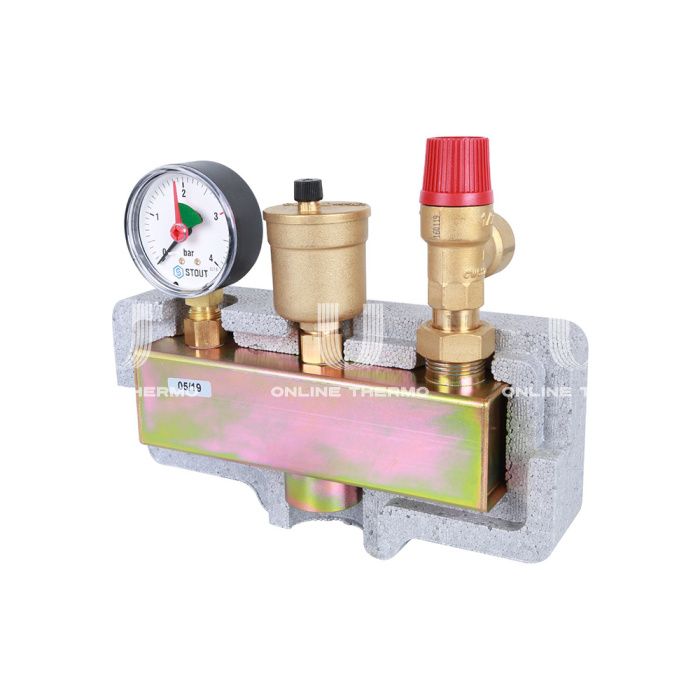 Группа безопасности Stout серии SVS-0004 применяется в закрытых системах водяного отопления для защиты от превышения максимально допустимого рабочего давления и отвода воздуха. Она состоит из предохранительного клапана, автоматического воздухоотводчика с запорным клапаном и манометра, смонтированных на общем основании – консоли из оцинкованной стали. Группу безопасности необходимо устанавливать строго вертикально в любой точке системы отопления выше котла, при этом, желательно, осуществлять установку в месте с минимально возможной температурой. На участке трубопровода от котла до группы безопасности запрещается установка запорной арматуры, фильтров и других элементов, которые могут уменьшить его проходное сечение. Группа безопасности котла выполняет следующие функции: Защита от превышения давления в системе; Отвод из системы воздуха и газов; Индикация давления в системе на уровне манометра.