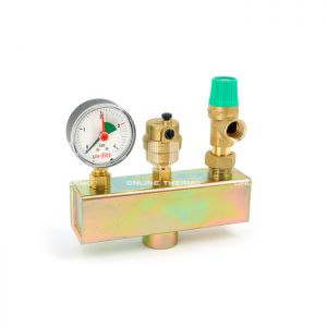 Группа безопасности Uni-Fitt серии 250A применяется в закрытых системах водяного отопления для защиты от превышения максимально допустимого рабочего давления и отвода воздуха. Она состоит из предохранительного клапана, автоматического воздухоотводчика с запорным клапаном и манометра, смонтированных на общем основании – консоли из оцинкованной стали. Группу безопасности необходимо устанавливать строго вертикально в любой точке системы отопления выше котла, при этом, желательно, осуществлять установку в месте с минимально возможной температурой. На участке трубопровода от котла до группы безопасности запрещается установка запорной арматуры, фильтров и других элементов, которые могут уменьшить его проходное сечение. Группа безопасности котла выполняет следующие функции: Защита от превышения давления в системе; Отвод из системы воздуха и газов; Индикация давления в системе на уровне манометра.