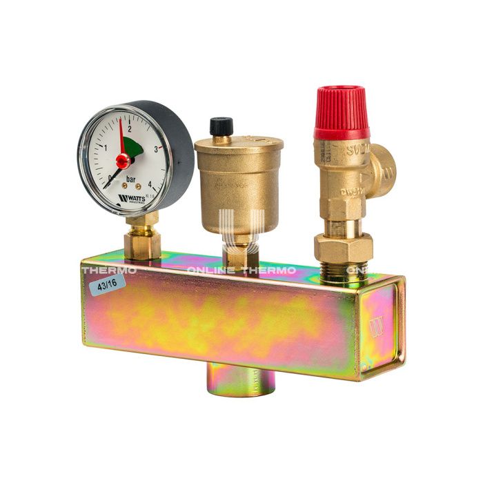 Группа безопасности Watts серии KSG 30 применяется в закрытых системах водяного отопления для защиты от превышения максимально допустимого рабочего давления и отвода воздуха. Она состоит из предохранительного клапана, автоматического воздухоотводчика с запорным клапаном и манометра, смонтированных на общем основании – консоли из оцинкованной стали. Группу безопасности необходимо устанавливать строго вертикально в любой точке системы отопления выше котла, при этом, желательно, осуществлять установку в месте с минимально возможной температурой. На участке трубопровода от котла до группы безопасности запрещается установка запорной арматуры, фильтров и других элементов, которые могут уменьшить его проходное сечение. Группа безопасности котла выполняет следующие функции: Защита от превышения давления в системе; Отвод из системы воздуха и газов; Индикация давления в системе на уровне манометра.
