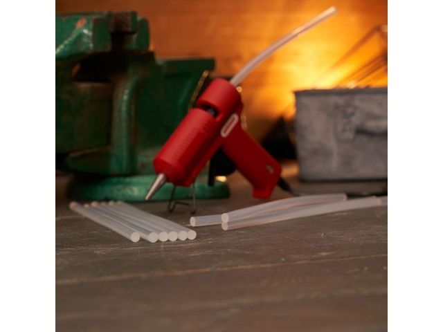 - бумагу, картон, дерево, стекло, пластик, кожу, керамику, камень и другие материалы. Клеевой пистолет подбирается в соответствии с диаметром стержня. Расходный материал не является термореактивным, при повторном нагревании его можно расплавить.