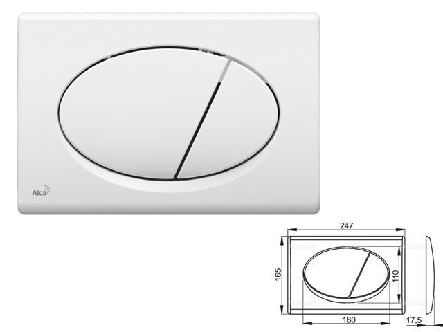 Область применения: - Для скрытых систем инсталляции и бачков для замуровывания в стену Свойства: - Кнопка минимально выступает над плиткой благодаря толщине всего 5,5 мм - Двойной смыв, механический принцип действия - Совместимость со всеми скрытыми системами инсталляции Alcaplast - Поверхностная отделка: белый - Материал: пластик Содержание комплекта: - Кнопка - Монтажная рама для установки кнопки - Резьбовое крепление монтажной рамы кнопки 2 шт. - Винт промывочного механизма 2 шт. - Шаблон для установки кнопок управления