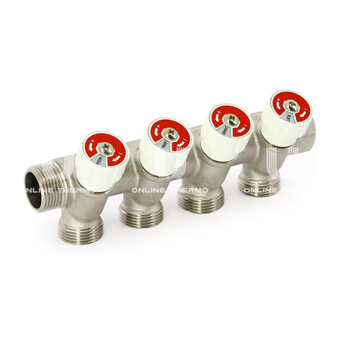 Коллектор распределительный с запорными клапанами Uni-fitt 402N3340, 3/4" ВР-НР, на 4 контура 3/4" НР, модульный, конусное соединение