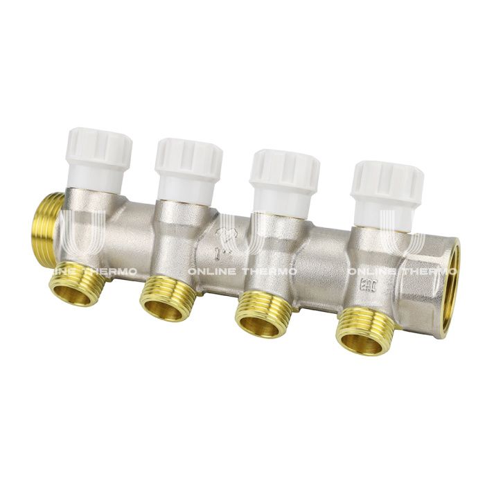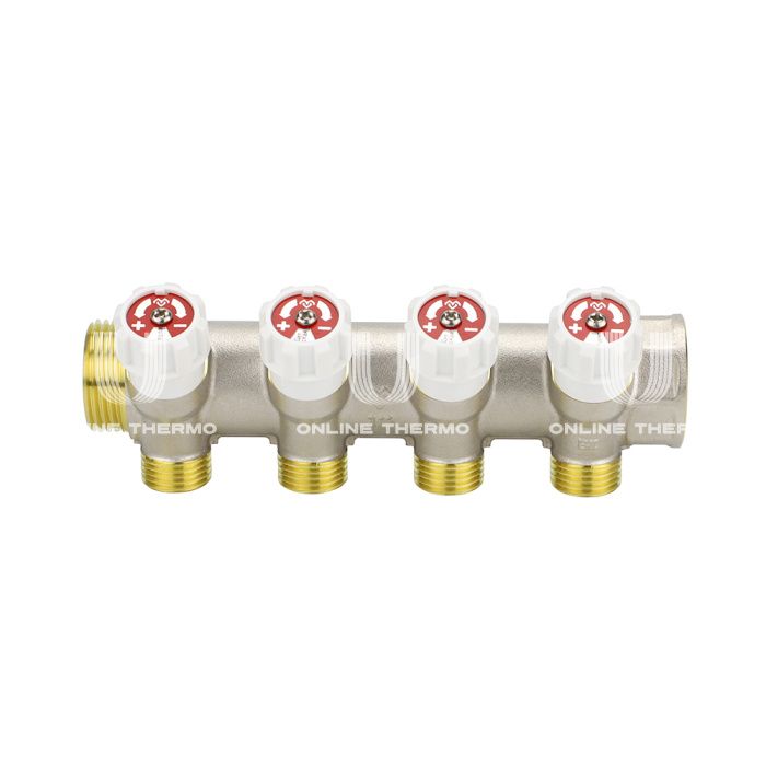 Коллектор распределительный с запорными клапанами Varmega VM14724, 1", на 4 выхода 1/2"