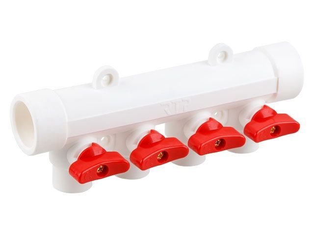 Коллектор с шар. краном красн. PPR 32х20/4, бел., РТП
