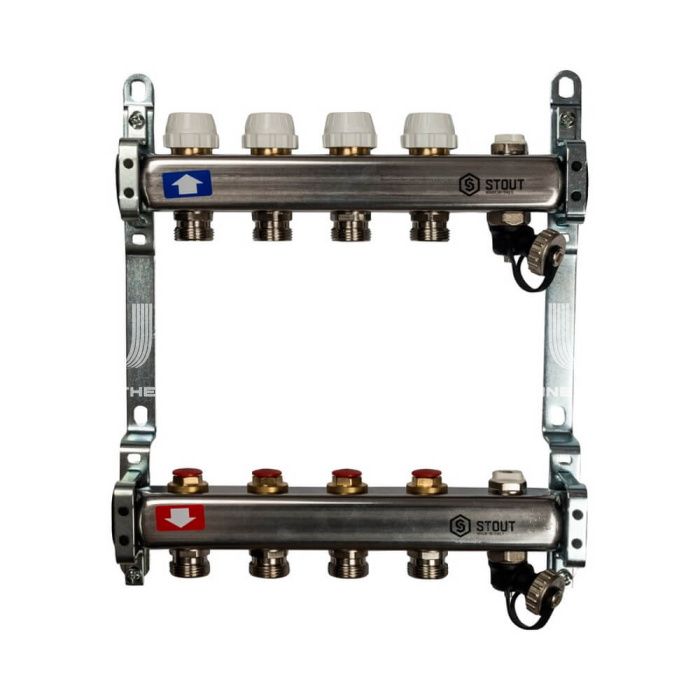 Коллектор Stout из нержавеющей стали без расходомеров, с воздухоотв. и сливом 4 вых.