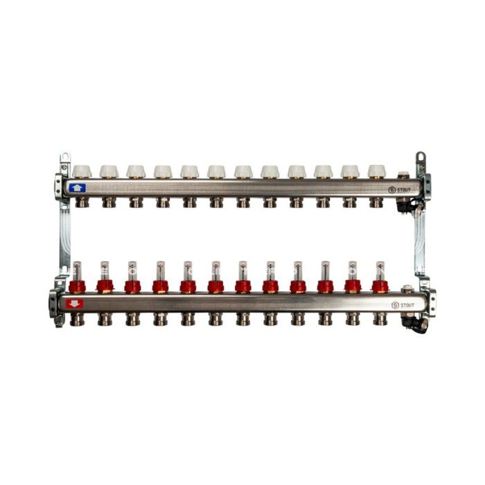 Коллектор Stout из нержавеющей стали с расходомерами, с воздухоотв. и сливом 12 вых.
