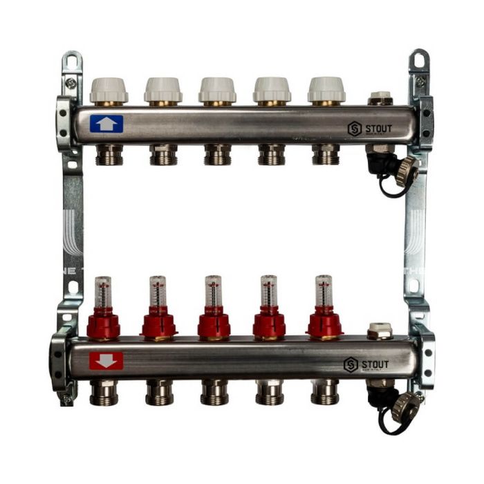Коллектор Stout из нержавеющей стали с расходомерами, с воздухоотв. и сливом 5 вых.