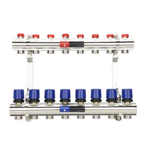 Коллекторные группы из латуни под брендом Varmega предназначены для распределения и регулирования потоков теплоносителя в низкотемпературных (серия VM154XX) и/или высокотемпературных (VM158XX) системах отопления. В качестве «потребителя» выступает прибор отопления, контур или петля «теплого пола», а также, отдельные части или ветви системы. Коллекторная группа состоит из двух латунных коллекторов, смонтированных на кронштейнах. На каждом отводе подающего коллектора, установлены ручные балансировочные вентили или расходомеры (ротометры), комбинированные с балансировочными вентилями. Такая конструкция позволяет настроить (сбалансировать) контуры системы отопления. Использование коллекторных групп с расходомерами позволяет произвести настройку, ориентируясь на объективные данные. Расходомеры показывают расход от 0 до 5 л/мин. Каждый отвод обратного коллектора снабжён термостатическим вентилем, который возможно регулировать вручную, а также установить на него электрический привод с присоединением М30×1.5. Присоединение циркуляционных петель осуществляется с помощью фитингов стандарта 3/4" «евроконус». Количество отводов для подключения контуров отопления у коллекторных групп варьируется от 2 до 13. Коллекторные группы поставляются без концевых групп, заглушек и фитингов, но комплектуются ими отдельно. Общие характеристики Количество выходов: от 2-х до 13 Материал корпуса: никелированная латунь CW617N Материал уплотнений: EPDM Диаметр подключения: G 1" Диаметр отводов: 3/4" евроконус Подключение электрического привода: M30x1,5 Рабочие условия Рабочая температура: от +5°C до +90°C Рабочее давление, бар: 10