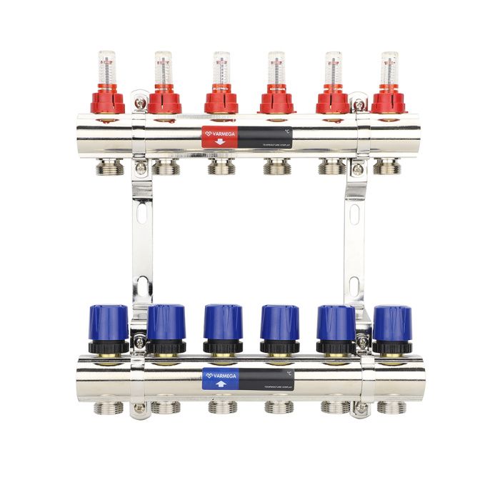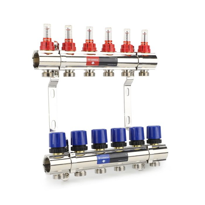 Коллекторная группа с расходомерами Varmega VM15406 ВР 1", на 6 контуров 3/4" EK, латунь