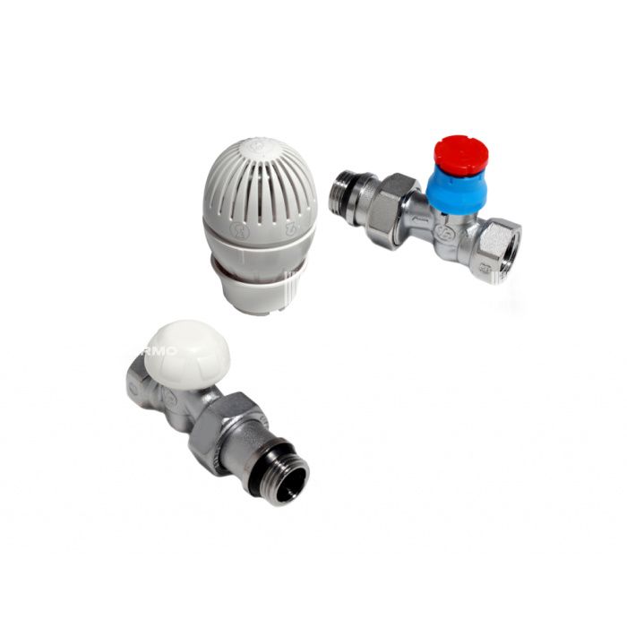 Комплект арматуры для подключения и термостатического регулирования радиаторов отопления Giacomini предназначен для подсоединения радиатора к системе отопления и индивидуального автоматического регулирования подачи теплоносителя в радиатор с целью поддержания температуры в помещении на заданном уровне и экономии энергии. Комплект может использоваться для подключения к радиаторам отопления различных типов, для двух трубных или однотрубных систем. Термостатический комплект R470F поставляется в красочной коробке и состоит из трех элементов: термостатического клапана, термостатической головки и отсечного балансировочного клапана. Комплект выпускается в размере 1/2", для автономных и двухтрубных систем, и в версии 3/4" с увеличенным расходом, для однотрубных систем с вертикальными стояками. Установленный на радиаторе комплект производит автоматическое регулирование подачи теплоносителя в радиатор, поддерживая температуру в помещении на заданном уровне. Изменение температуры в комнате приводит к изменению объема жидкости в сенсоре, находящемся внутри головки. Изменение объема приводит к перемещению внутреннего механизма, обеспечивающего открытие или закрытие клапана, для изменения количества теплоносителя, поступающего в радиатор. При достижении необходимой температуры в комнате, термоголовка постепенно закрывает клапан, позволяя протекать только небольшому количеству воды, для поддержания в комнате заданной температуры. Технические характеристики: рабочая температура воздуха: +8...+32°С; допустимая относительная влажность воздуха: 85%; допустимая концентрация гликоля: 50%; испытательное давление: 15 бар. Комплект поставки: клапан термостатический R402TG прямой арт. R402X133 - 1 шт.; клапан запорный R15TG прямой арт. R15X032 -1 шт.; элемент термостатический (головка термостатическая) R470 арт. R470X001 - 1 шт.; паспорт - 1 шт.