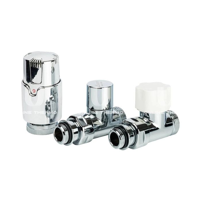 Присоединительный размер – G1/2. Цвет - хром. В комплекте KT 258/A: RD 258/A - прямой радиаторный вентиль с защитным колпачком под термостатическую или термоэлектрическую головку; DD 78/A - прямой регулирующий клапан радиатора; TA 1200 - термостатическая головка со встроенным регулятором температуры и датчиком.