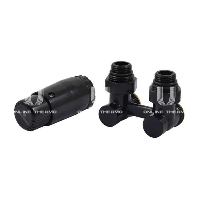 Комплект Schlosser Standard из узла нижнего подключения 1/2"х3/4" ЕК и термоголовки М30х1.5 600800067 Ral 9005, с ниппелями, угловой