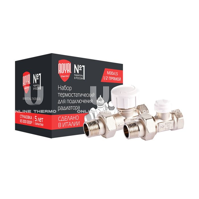 Состав комплекта:Клапан термостатический прямой, клапан запорный прямой