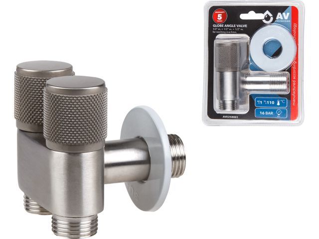 Кран вентильный угловой 1/2' нар. Х 1/2' нар. Х 1/2' нар. установочный, AV Engineering(Нерж. сталь, макс. 16 бар, макс. 110 °С)
