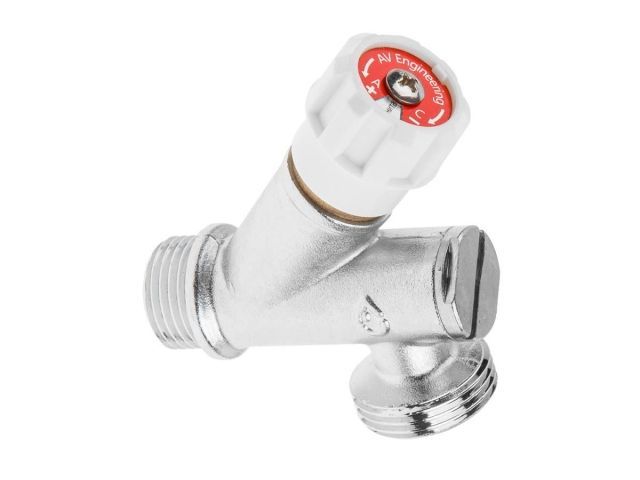 Кран вентильный угловой 1/2' нар. Х 3/4' нар. установочный ХРОМ для стир. машины с фильтром, AV Engi(Латунь, макс. 16 бар, макс. 110 °С)