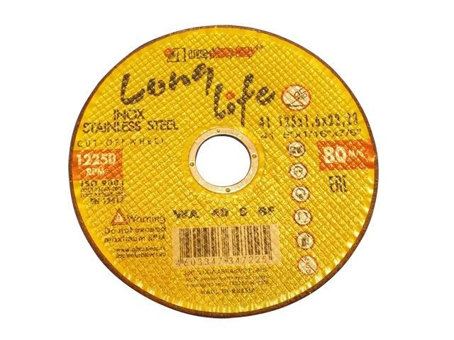 Шлифматериал: электрокорунд белый; Шлифзерно: 54 Твердость: твердые; Связка: бакелитовая с наличием упрочняющих элементов; Рабочая скорость: 80 мс; Допустимая скорость вращения: 12 250 обмин Специальный состав кругов Inox, которые не содержат железа, серы и хлора, позволяет избежать прижогов разрезаемого материала и его загрязнения в процессе обработки. Для высокопроизводительной резки деталей и конструкций из благородныз нержавеющих сталей.