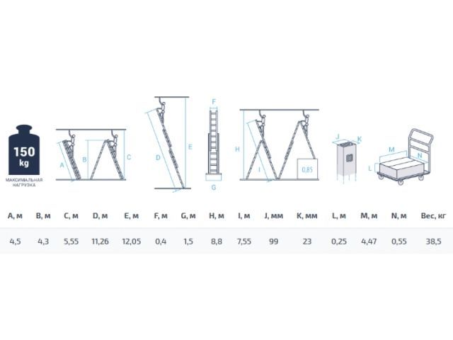 Технические преимущества: Направляющие кронштейны из прессованного алюминиевого сплава для надежного удержания выдвижной секции во всех рабочих положениях. Рифлёные ступени с шагом 260 мм для безопасного подъёма и спуска. Надёжно закреплённые на стойках и траверсе опорные наконечники из двухкомпонентного пластика: жесткий компонент отвечает за надежность крепления, мягкий препятствует скольжению лестницы. Широкая поперечная траверса для повышения устойчивости. Многократная развальцовка в соединении ступеней со стойками для высокой прочности и долговечности. Стойки и ступени изготовлены из прессованного алюминиевого профиля. Алюминиевые зацепы с автоматическим фиксатором. Варианты использования: приставная лестница приставная выдвижная двухсекционная лестница приставная выдвижная трехсекционная лестница двухсторонняя стремянка стремянка с выдвижной секцией Максимальная нагрузка - 150 кг Рабочая высота - 555-1205 см