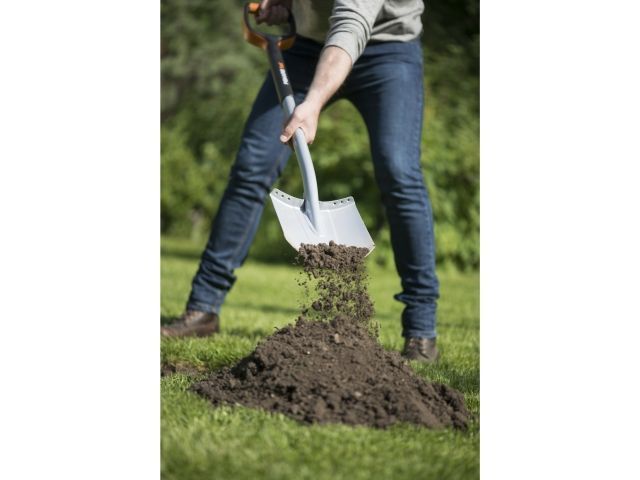 Садовая лопата. Материал лопаты - закаленная сталь с антикоррозийным покрытием. Материал черенка - полиамид, укрепленный стекловолокном. Рукоятка окрашена в стильный и яркий оранжевый цвет, чтобы избежать потери инвентаря. Фрикционная поверхность рукоятки позволяет выполнять любые виды садовых работ и удобно держать ее в руках. Для надежной фиксации черенка и лопаты специалисты компании Fiskars применяют новаторский тип сварки. Длина инструмента составляет 1,2 м. Размеры лопаты: 19,229,5 см. Вес инстумента - 2 кг.