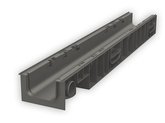 Канал пластиковый системы STANDART из вторичного ПЭ-ПП. Сформированное отверстие для подключения труб 50 мм, 110 для выпуска через дно лотка. Специальный паз для подключения других лотков под углом 90 градусов и специальным пазом для распила лотка. Класс нагрузки А 15- С 250.