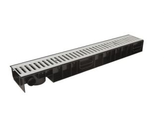 Канал пластиковый системы STANDART из вторичного ПЭ-ПП. Сформированное отверстие для подключения труб O 50 мм., O 110 для выпуска через дно лотка. Специальный паз для подключения других лотков под углом 90? и специальным пазом для распила лотка. Оцинкованная стальная решетка. Крепление: стальная оцинкованная планка с болтом. Класс нагрузки А 15. Материал: Вторичный ПЭ – ПП Оцинкованная сталь