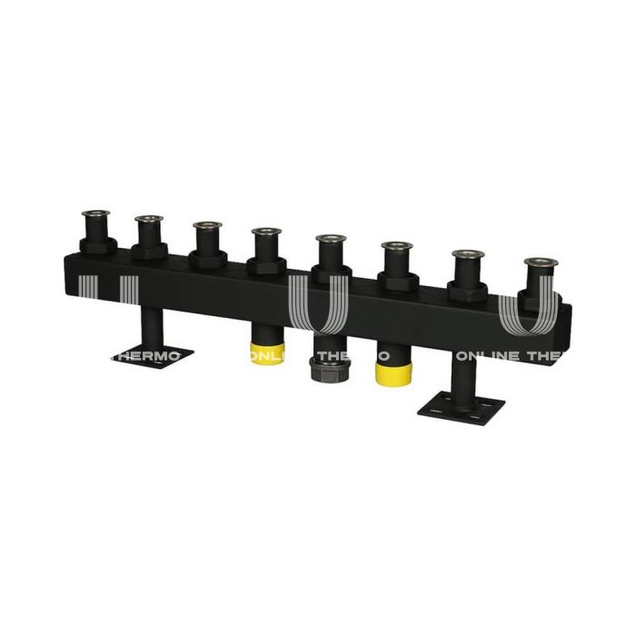 Распределительный коллектор Stout представляет собой одну стальную коробчатую трубу прямоугольного сечения, к которой снизу и сверху соосно приварены парные патрубки (входные и выходные). Внутри трубы выполнены фигурные перегородки для разграничения прямого и обратного потоков теплоносителя и организации распределения его между всеми выходными патрубками коллектора. Зигзагообразная форма перегородок позволяет расположить патрубки вдоль одной оси коллектора. Стальной распределительный коллектор серии SDG-0016 с верхним расположением выходных патрубков предназначен для пропорционального распределения теплоносителя. Верхние патрубки коллектора оснащены накидными гайками для обеспечения быстрого монтажа насосных узлов и элементов гидромодуля, а нижние имеют наружную резьбу. Благодаря защите коллекторов изоляционным материалом, значительно снижаются тепловые потери, снижаются риски получения ожогов при обслуживании системы. Вне зависимости от конструктивных особенностей, надежность крепления коллекторов к несущим элементам зданий, обеспечивается при помощи кронштейнов, входящих в комплект к каждому коллектору. Распределительные коллекторы Stout являются составляющим элементом групп быстрого монтажа Stout. Предназначены для приема теплоносителя от источника тепловой энергии и его распределения между системами теплопотребления здания. Коллекторы являются основой для соединения всех остальных элементов между собой: гидравлического разделителя, насосных узлов и пр. Модификации коллекторов позволяют компоновать гидромодули самой различной конфигурации. Полная заводская готовность распределительных коллекторов и других элементов обеспечивает быстрый и легкий монтаж системы.