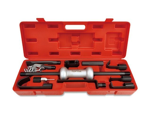 Молоток обратный для кузов. работ с компл. насадок (JGAI1202) Предназначен для ремонта кузова, шасси, концов бампера, кромки крыла, двери, кромки двери и др. В комплект входит: 1. обратный молоток 2. большой крюк пластинчатого типа 3. малый крюк пластинчатого типа 4. крюк пластинчатого типа ( угол 90) 5. тонкий крюк пластинчатого типа ( угол 90) 6. винтовой съемник 7. плоская пластина 8. трубка с лопаткой 9. цепь и крючек