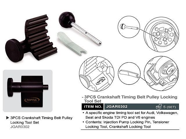Набор для фиксации коленвала TOPTUL применяется при проведении ремонтных работ с TDI, PD и V6 двигателями Audi, Volkswagen, Seat и Skoda. В набор входят 3 предмета: стопорный штифт для фиксации шкива топливного насоса; -инструмент для фиксации ролика-натяжителя; -приспособление для фиксации коленвала.