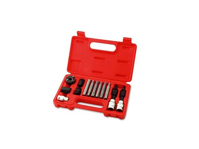 Набор TOPTUL из 13 предметов предназначен для съема шкивов генераторов как в демонтированном состоянии, так и установленных на автомобиле. Рекомендуется для профессионального использования.