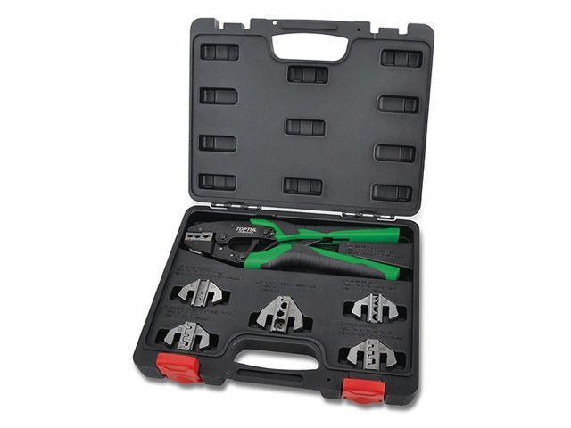Набор для обжимки клемм универсальный. Уникальная конструкция механизма клещей обеспечивает полную обжимку. Храповый механизм упрощает работу и экономит время. Быстрая смена вставок без применения какого-либо инструмента. Эргономичная удобная рукоятка. Качественный набор инструментов для обимки клемм, пригодный для электриков различных специализаций.