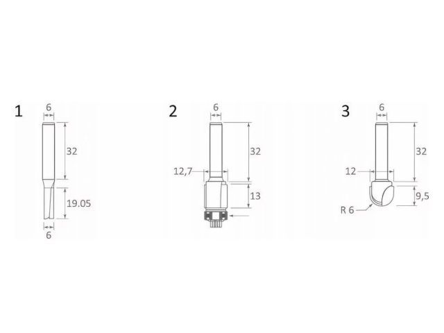 Описание: Набор Makita D-30209, предназначен для фрезеров Макита, состоит из трех фрез: Диаметр режущей части: 1 фреза-6 мм; 2 фреза-12.7 мм; 3 фреза-12 мм; Длина 32 мм, Длина режущей части: 1 фреза-19.05 мм; 2 фреза-13 мм; 3 фреза-9,5 мм.