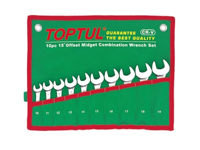 Набор из 10 коротких (укороченных) комбинированных ключей TOPTUL GAAA1001. Изготовлены из хром-ванадиевой стали с защитой от коррозии. Для профессионального использования. Размеры ключей: 10 мм, длина 95 мм 11 мм, длина 99 мм 12 мм, длина 103 мм 13 мм, длина 107 мм 14 мм, длина 113 мм 15 мм, длина 117 мм 16 мм, длина 121 мм 17 мм, длина 127 мм 18 мм, длина 131 мм 19 мм, длина 137 мм Серия AAAF101052-191952