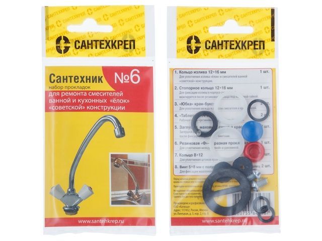 Набор сантехнических прокладок и колец Сантехник №6 Упаковка из 7 типов прокладок: 1. Кольцо излива 12х16 мм - 1 шт 2. Стопорное кольцо 12х16 мм - 1 шт 3. Юбка кран-буксы - 2 шт 4. Таблетка 14 мм - 2 шт 5. Заглушка маховика синяя и красная - 2 шт 6. Резиновая Ф-образная прокладка - 1 шт 7. Кольцо 8х12 - 2 шт 8. Винт 5х8 мм с полукруглой головкой - 2 шт