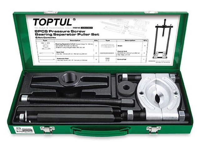 Набор съемников спараторного типа Toptul JGAD0801 состоит из 8 предметов (75-105 мм) и предназначен для съема шариковых и роликовых подшипников, а также внутренних колец. Сепаратор сжимается благодаря равномерному затягиванию гаек на распорных болтах.