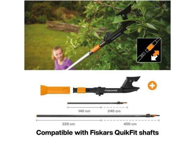 Насадка-сучкорезветкорез с системой крепления QuickFit. Без комплектации ручкой или черенком не используется. Рычаг и катушка обеспечивают мощность резки в 12 раз по сравнению со стандартными механизмами. Угол режущей головки инструмента можно отрегулировать ко второй позиции угла 26 без необходимости опускать продукт. Способ крепления инструмента обеспечивает фиксацию двумя руками и, следовательно, дополнительную стойкость. Просто прикрепите веткорез к одному из телескопических черенков Fiskars QuikFit и наслаждайтесь резкой веткой. Длина:400 мм; Вес: 480 г Гарантия: 2 года