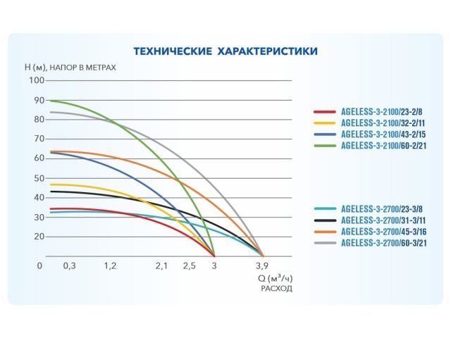 Расшифровка модели насоса на примере: AGELESS-3-210023-28 - Сначала идет серия: AGELESS - серия насосов с 2м кабелем требующим удлинения (вилки нет) GOOD WORK - серия насосов с длинным кабелем вилка - Затем диаметр насоса: 2,5 - диаметр 2,5 дюйма 3 - диаметр 3 дюйма - Далее следует производительность: 210023 - значит, что насос качает 2,1 м3 в час при напоре 23 м - Затем идет обозначение максимальной производительности: 2 - до 3 м3 в час. 3 - до 4 м3 в час - Количество рабочих колёс обозначается последней цифрой: - Обозначение наличия пусковой коробки: А (буква А есть) - пусковой коробки нет (значит конденсатор внутри корпуса насоса кабель трехжильный) (буквы А нет) - пусковая коробка есть (значит конденсатор внутри коробки кабель четырехжильный)