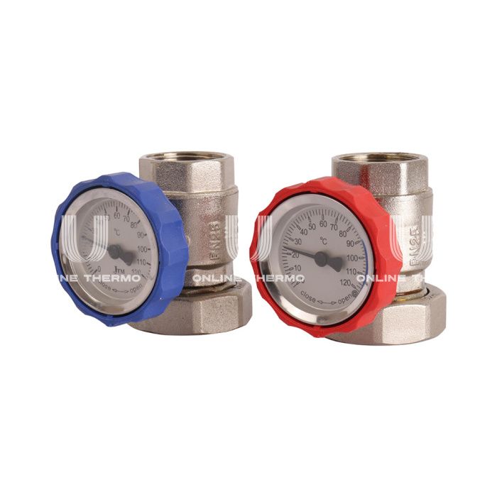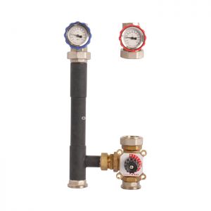Насосная группа с 3-х ходовым приводным смесителем 1˝ без насоса представляет собой готовый комплект арматуры и предназначена для присоединения контура теплого пола/ бойлера/радиаторного отопления с возможностью ручной регулировки температуры жидкости или автоматической регулировки с помощью установки сервопривода и термостатического датчика на трехходовой кран в подающей линии. Циркуляционный насос в комплект группы не входит и заказывается отдельно, в зависимости от требуемых характеристик контура теплого пола/радиаторного отопления/бойлера. Состав: Шаровые краны с термометром на обратной и подающей линиях (синий/красный) с накидной гайкой 1 ½ Труба обратной линии, подключение 1 ½ (наружная резьба) с отводом и накидной гайкой 1˝, для присоединения к трехходовому крану Трехходовой кран в линии подачи с накидной гайкой (1 ½) для установки насоса, с установочными отверстиями для подключения сервопривода (Kv – 8 м3 ч) Уплотнительные кольца для герметичного соединения комплектующих группы