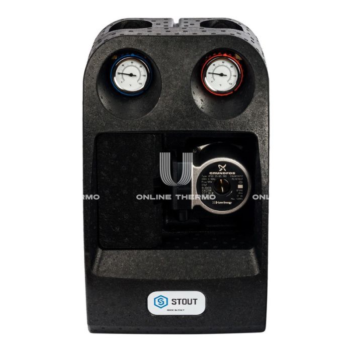 Насосные группы Stout являются элементами гидромодуля быстрого монтажа полной заводской готовности. Предназначены для обеспечения требуемого температурного и гидравлического режимов в системах теплопотребления здания. Насосная группа быстрого монтажа с четырёхходовым термостатическим клапаном предназначена для обеспечения принудительной циркуляции и поддержания постоянной температуры теплоносителя в системе отопления, например, в системе типа «теплый пол». Поддержание фиксированной точки температуры достигается при помощи термостатического элемента, который встроен внутрь клапана и перемещается благодаря расширению рабочего тела внутри него. Насосная группа может поставляться как в комплекте с насосом Grundfos, так и без него. Во втором случае возможно использование любого другого аналогичного насоса с соответствующей монтажной длиной и наружной резьбой под гайки для присоединения насоса к деталям группы. Со стороны системы теплопотребления все насосные группы снабжены запорными шаровыми кранами, совмещенными со стрелочными термометрами. На возвратной линии шаровой кран совмещен с обратным клапаном. Насосные группы DN25 (SDG-0002-002501,SDG-0002-002502, SDG-0002-002503)имеют штуцеры для установки байпасного перепускного клапана.