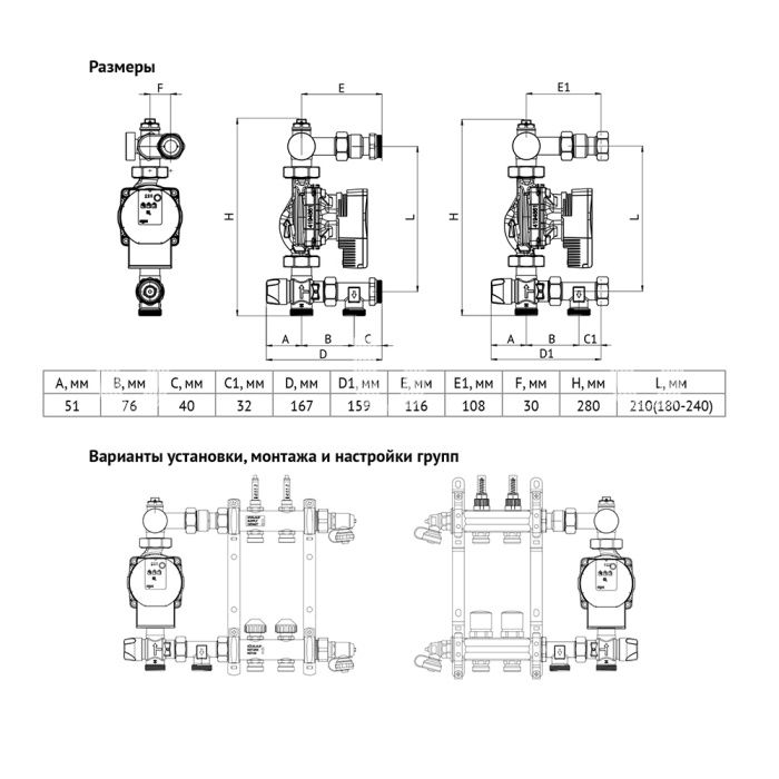 Насосно-смесительная группа SOLOMIX Х Uni-Fitt предназначена для создания низкотемпературных систем отопления (типа «тёплый пол»). Монтируется на коллекторной группе низкотемпературного контура, подключается к высокотемпературному контуру системы отопления. Насосно-смесительная группа SOLOMIX Х Uni-Fitt поставляется в 10 вариантах: С наружной резьбой без насоса (для монтажа требуется установка насоса), артикул 473M0000; с насосом Uni-Fitt SCP 25/60 130, артикул 473S0800; с насосом Wilo RS 25/6-130, артикул 473W0800; с насосом Grundfos UPSO 25-65 130, артикул 473G0800; с энергоэффективным насосом Uni-Fitt ECP 25/60 130, артикул 473E0800; с энергоэффективным насосом Wilo Para 25/6-130, артикул 473P0800; с энергоэффективным насосом Grundfos UPM3 AUTO 25-70 130, артикул 473U0800. С накидной гайкой без насоса (для монтажа требуется установка насоса), артикул 473F0000; с насосом Uni-Fitt SCP 25/60 130, артикул 473S0802; с насосом Wilo RS 25/6-130, артикул 473W0802; с насосом Grundfos UPSO 25-65 130, артикул 473G0802; с энергоэффективным насосом Uni-Fitt ECP 25/60 130, артикул 473E0802; с энергоэффективным насосом Wilo Para 25/6-130, артикул 473P0802; с энергоэффективным насосом Grundfos UPM3 AUTO 25-70 130, артикул 473U0802. Комплектация: верхний гидравлический блок (подача в низкотемпературный контур отопления), включающий автоматический клапан для удаления воздуха 1/2", контрольный термометр и эксцентрик с наружной резьбой или накидной гайкой со стороны подключения коллектора; нижний гидравлический блок (возврат из низкотемпературного контура отопления) состоит из 3-ходового термостатического смесительного клапана и тройника с наружной резьбой или накидной гайкой со стороны подключения коллектора; циркуляционный насос (в зависимости от комплектации); паспорт.