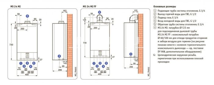 Настенные двухконтурные низкотемпературные котлы для отопления и мгновенного получения горячей воды благодаря пластинчатому теплообменнику. Отличительные особенности: MS 24 MI (открытая камера сгорания) — с подключением к дымовой трубе MS 24 MI FF (закрытая камера сгорания) — с принудительным отводом продуктов сгорания, для подключения к горизонтальному или вертикальному коаксиальному дымоходу (конфигурации С12х, С32х), к раздельным трубопроводам забора воздуха и удаления продуктов сгорания (конфигурация С52) или к системе 3СЕ (конфигурация С42х) Возможна работа на природном газе или пропане (набор для переоборудования на пропан заказывается как дополнительное оборудование) Первичный медный теплообменник покрыт слоем алюминиево-кремниевой краски, для увеличения его жаростойкости Атмосферная горелка с рампой из нержавеющей стали, электронным розжигом и ионизационным контролем пламени Газовый блок с 2 клапанами безопасности и с внешним устройством модуляции мощности Функциональная электронная панель управления с цифровым дисплеем Гидравлический блок из композитного материала содержит: 2-скоростной насос с автоматическим воздухоотводчиком, автоматический байпас, переключающий клапан отопление/ГВС (расположен на обратной линии), реле давления воды, кран для слива, предохранительный клапан на 3 бар, манометр, пластинчатый теплообменник из нержавеющей стали и расходомер с турбинкой для измерения расхода горячей воды, съемные фильтры для контуров отопления и ГВС, ограничитель расхода для контуров отопления и ГВС Датчик тяги для котла с открытой камерой сгорания и вытяжной вентилятор и реле давления воздуха для моделей с закрытой камерой сгорания Расширительный бак объемом 6 литров, монтажная планка для настенного крепления и кабель питания для подключения к электрической сети входят в комплект поставки котла Принадлежности для гидравлического подключения заказываются отдельно Объем поставки: 1 упаковка