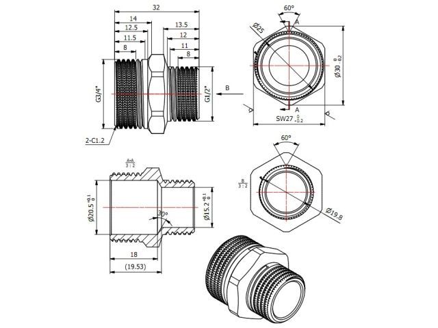 Ниппель ред. 3/4' нар. х 1/2'нар., AV Engineering (инд. упак.)(Латунь, макс. 16 бар, макс. 100 °С)
